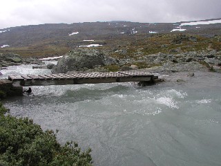 | Toilette (mit Torfstreu vorn links) | Regen führte zu Hochwasser, so daß die Brücke verlängert werden mußte, um von der Snøhetta kommend die Hütte trockenen Fußes zu erreichen. | ||